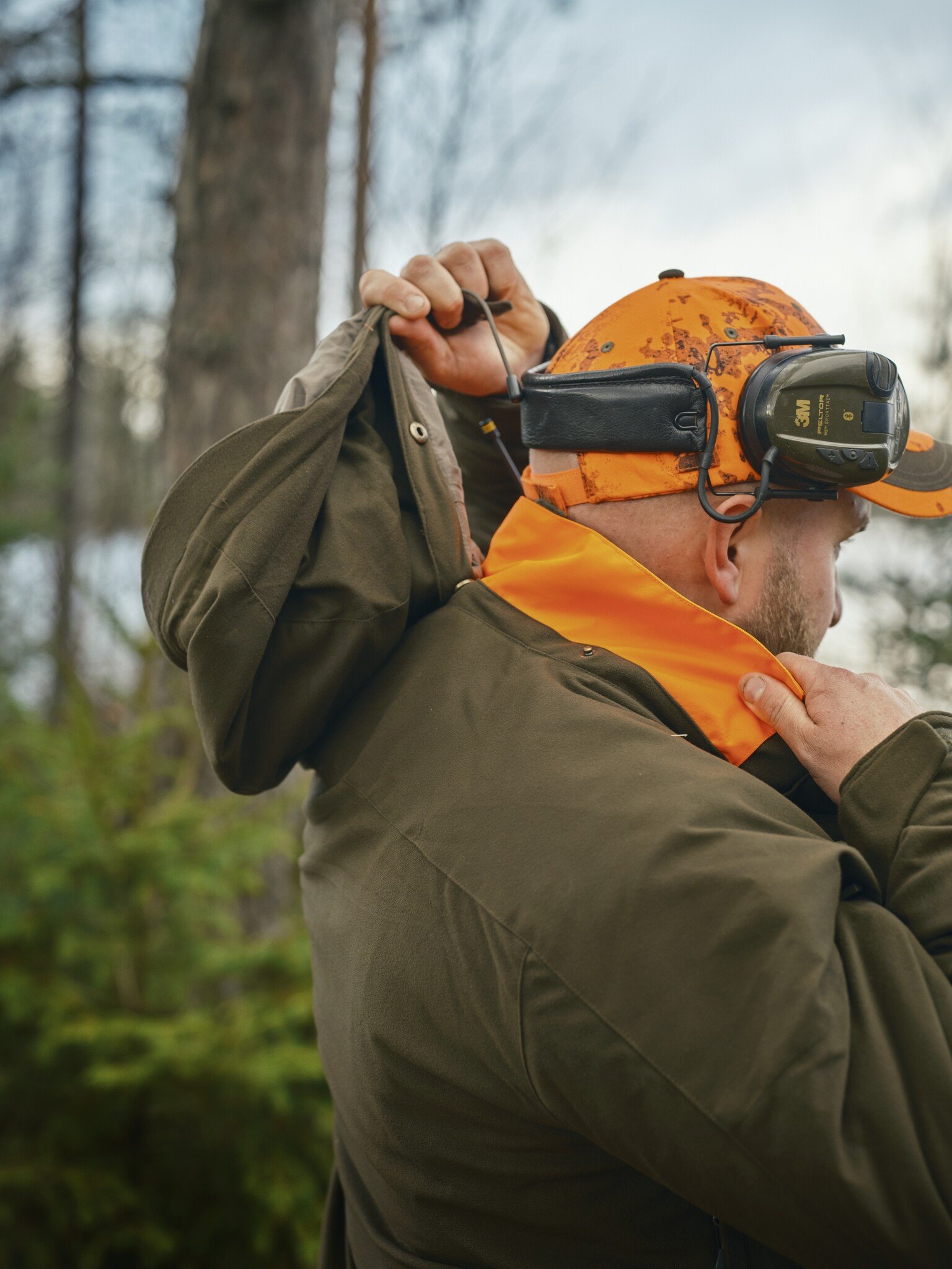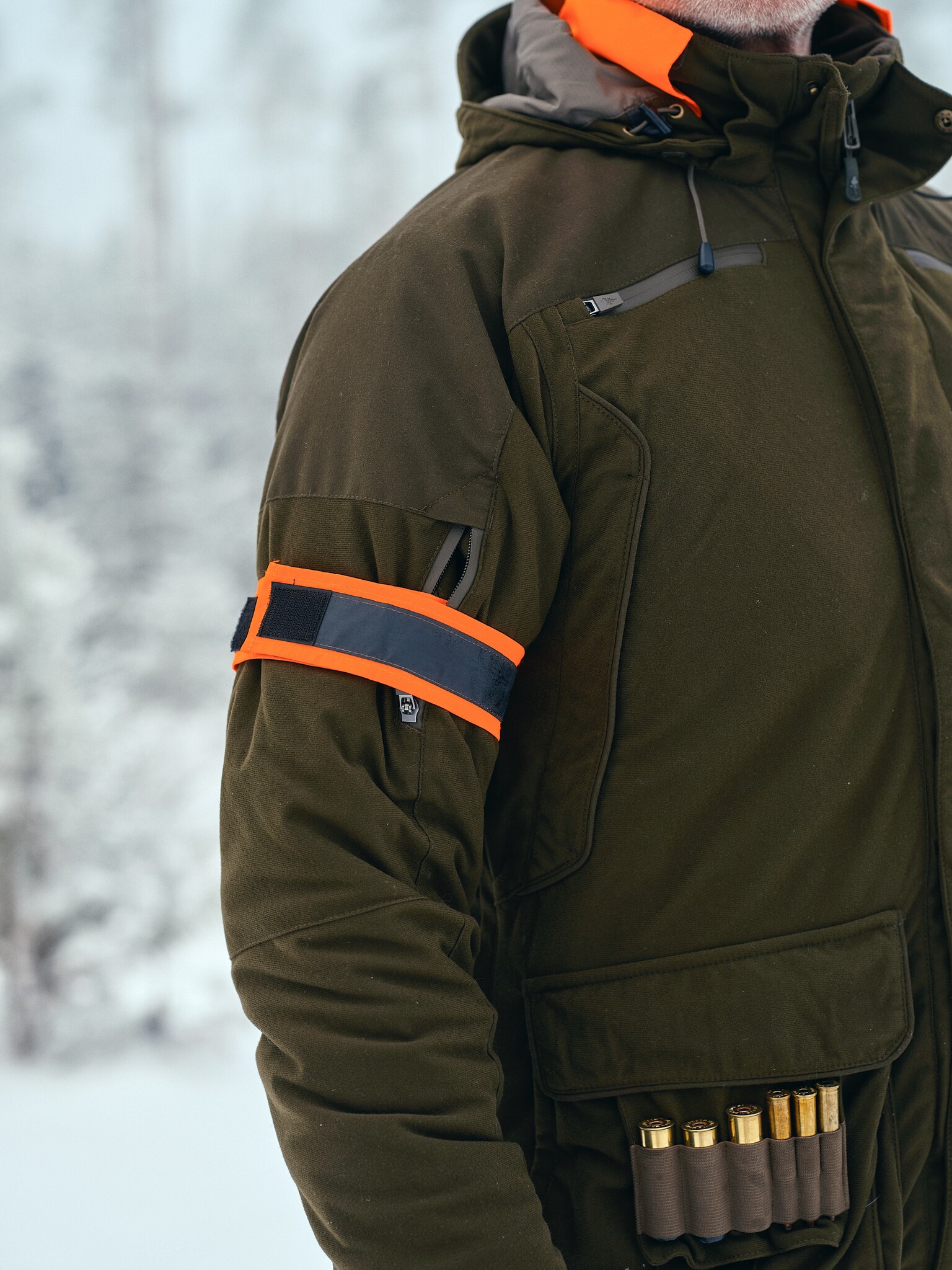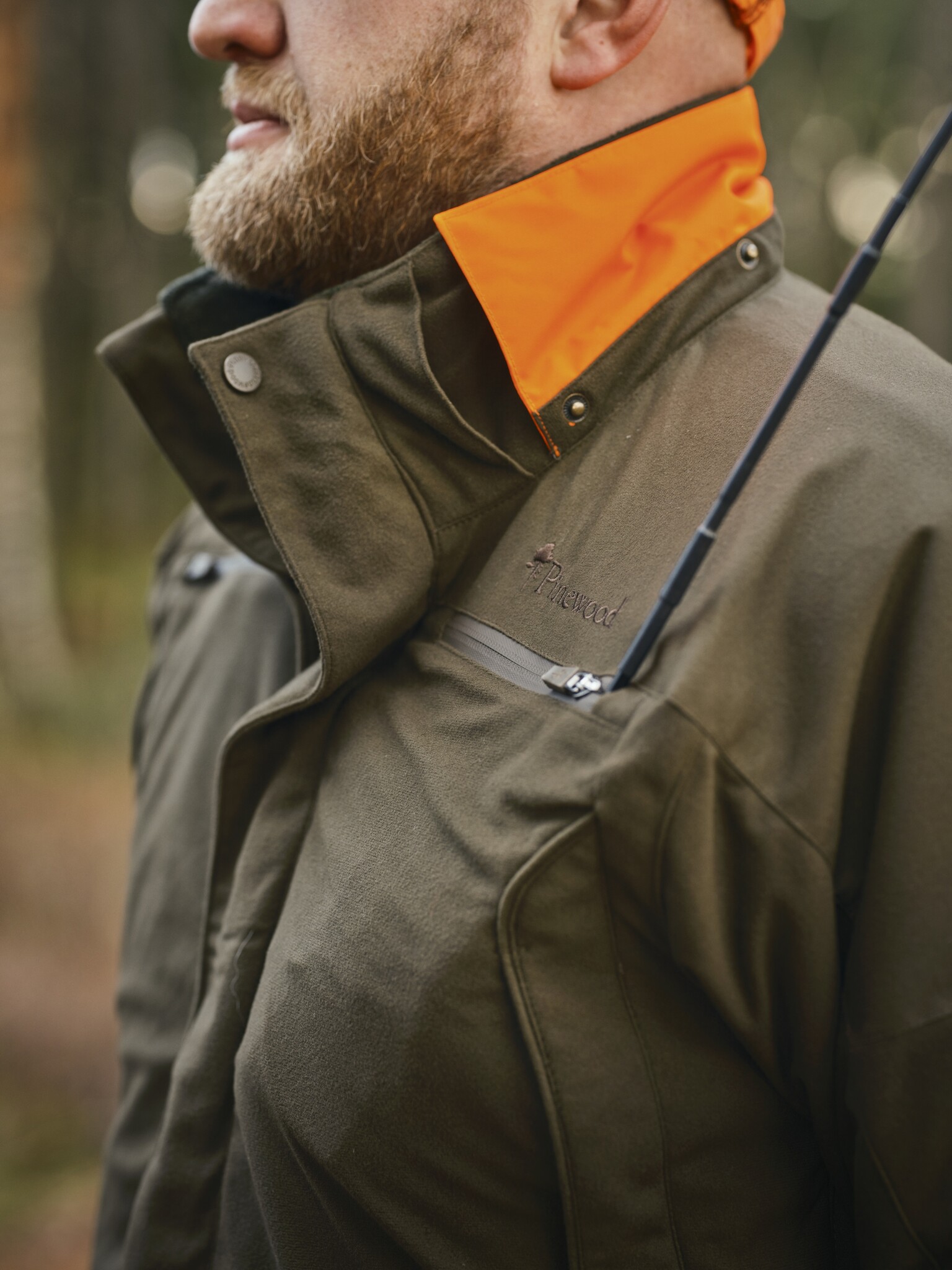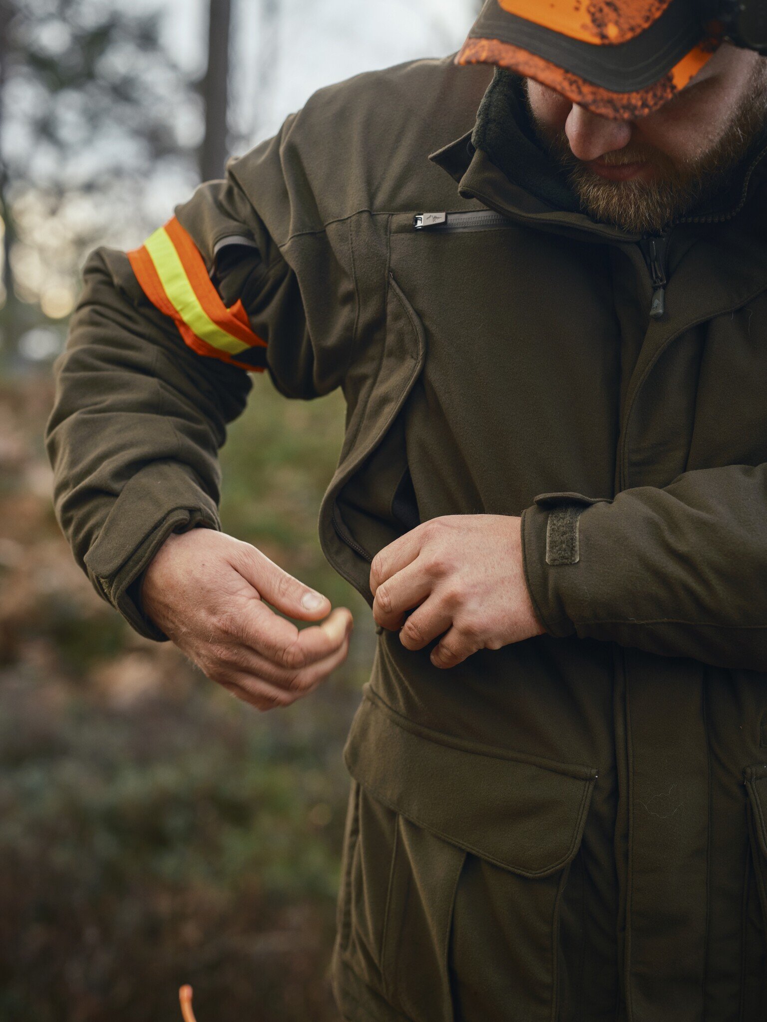 De jas beschikt over diverse zakken, waaronder twee radiozakken, een GPS-zak met rits, fleecegevoerde handwarmerzakken, een wildzak met rits, een binnenzak met rits, en een klein zakje met veiligheidsbandje. De afneembare capuchon is verstelbaar en heeft een versterkte klep voor bescherming tegen regen. De jas heeft een praktische 2-way rits met magneetsluiting en polsbanden met duimgaten om de kou buiten te houden. De extra oranje kraag verhoogt de zichtbaarheid.