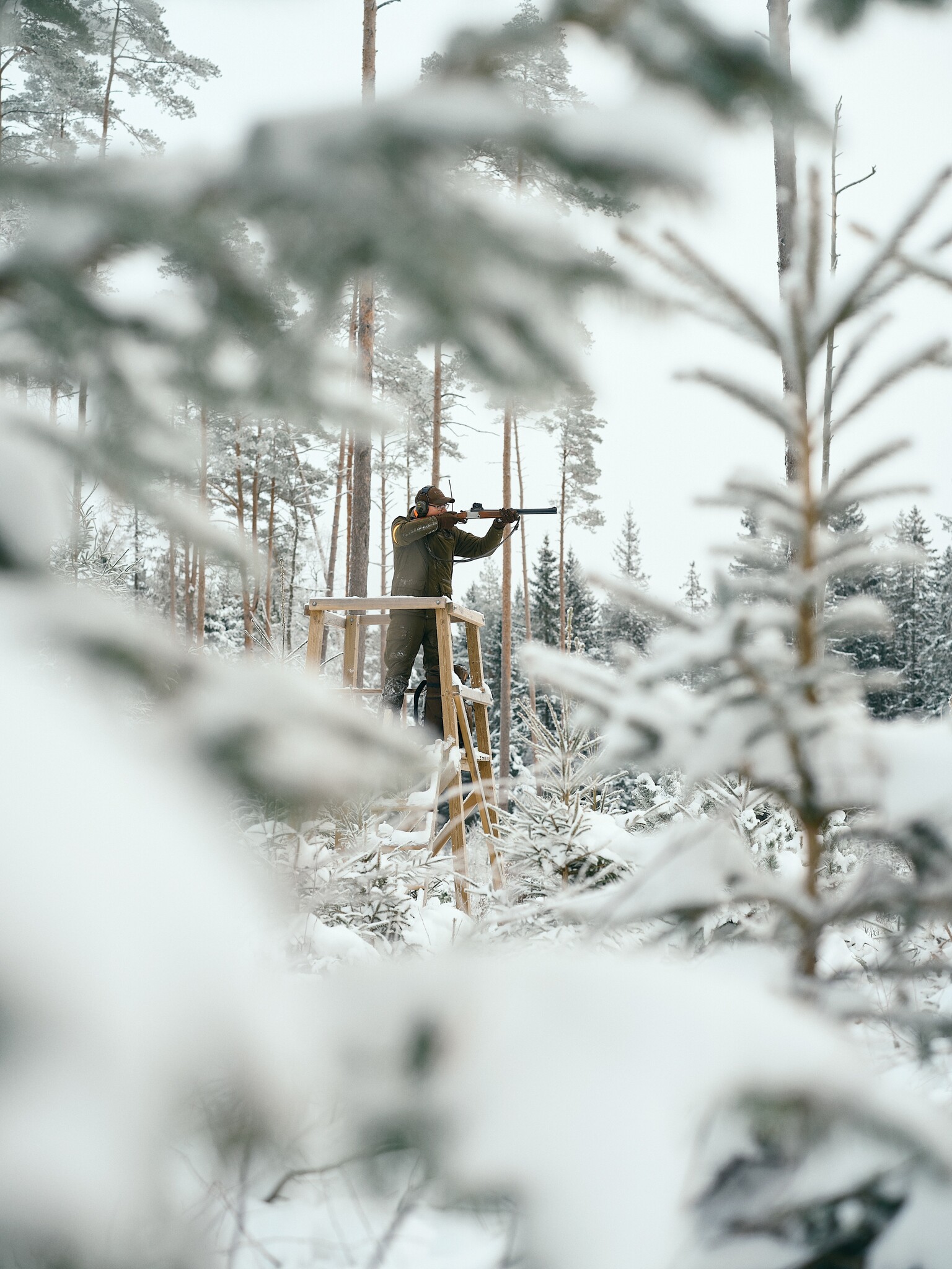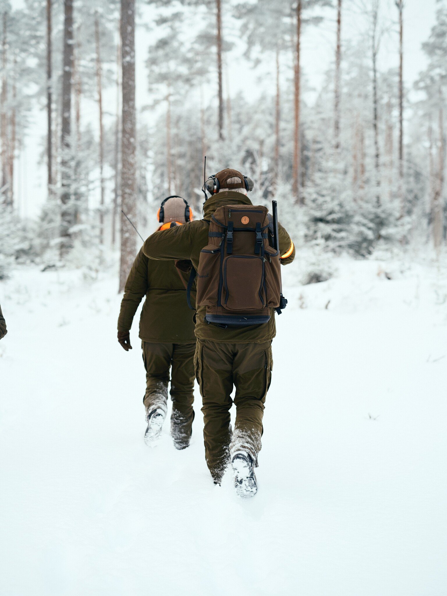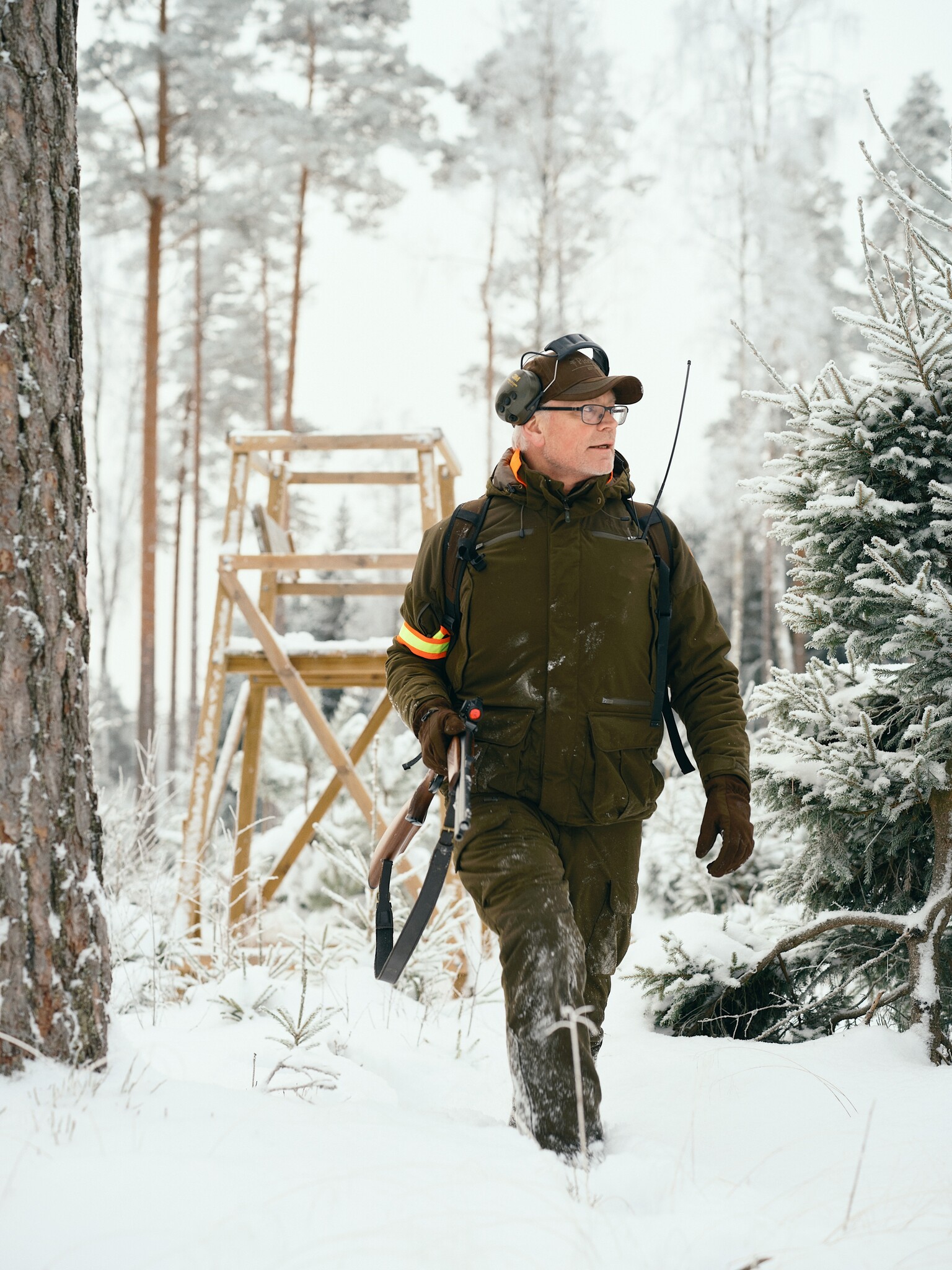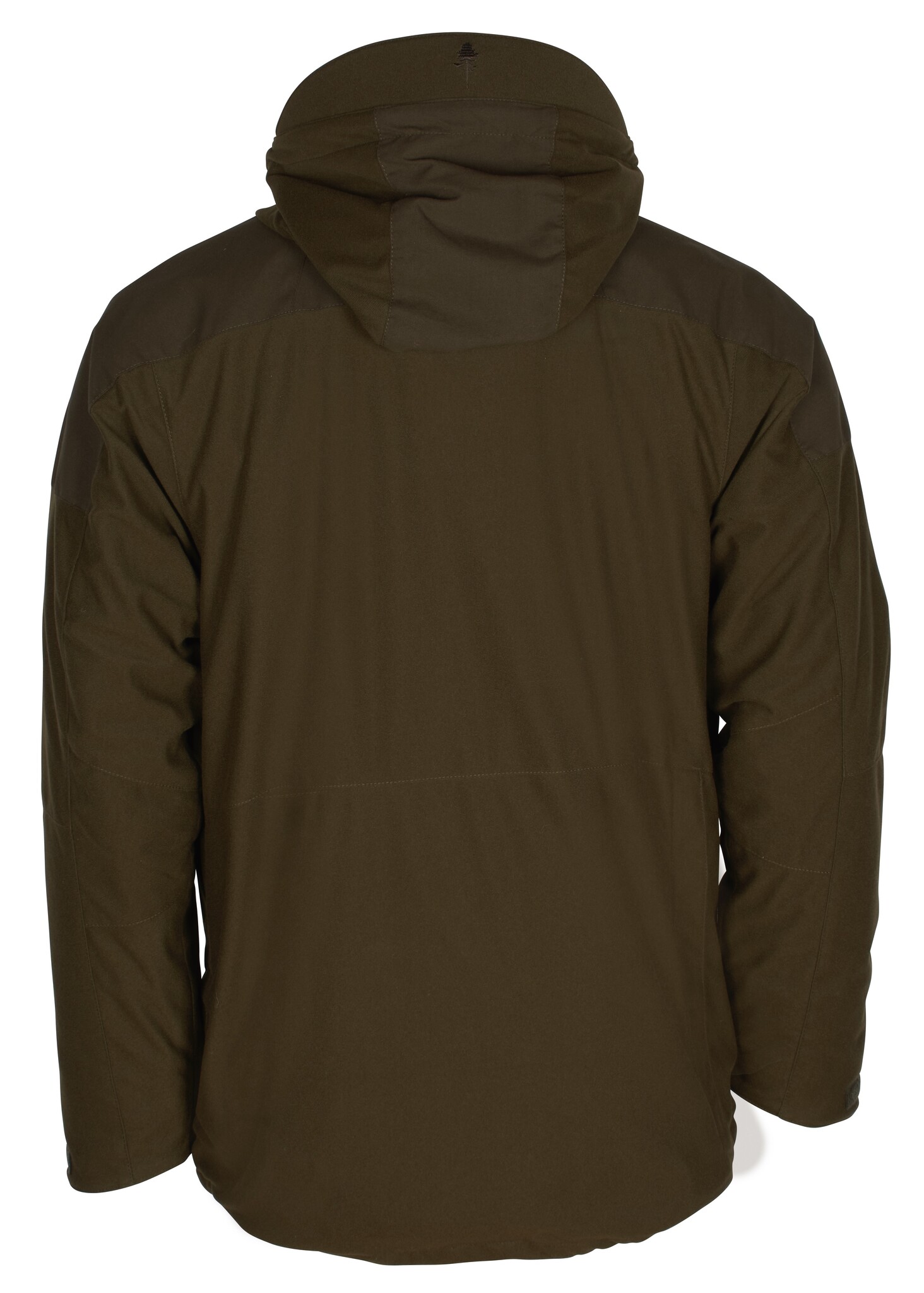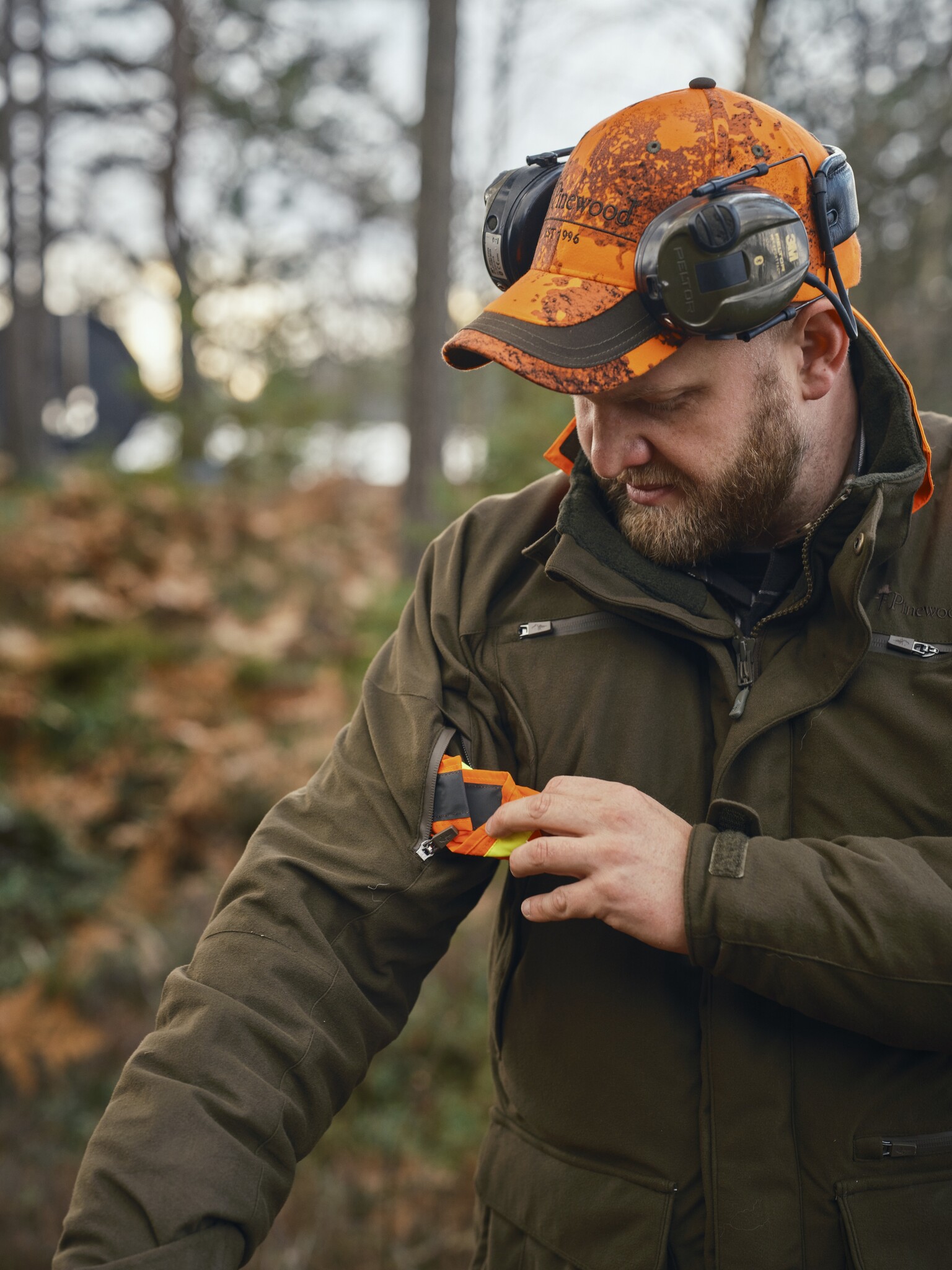 De jas beschikt over diverse zakken, waaronder twee radiozakken, een GPS-zak met rits, fleecegevoerde handwarmerzakken, een wildzak met rits, een binnenzak met rits, en een klein zakje met veiligheidsbandje. De afneembare capuchon is verstelbaar en heeft een versterkte klep voor bescherming tegen regen. De jas heeft een praktische 2-way rits met magneetsluiting en polsbanden met duimgaten om de kou buiten te houden. De extra oranje kraag verhoogt de zichtbaarheid.