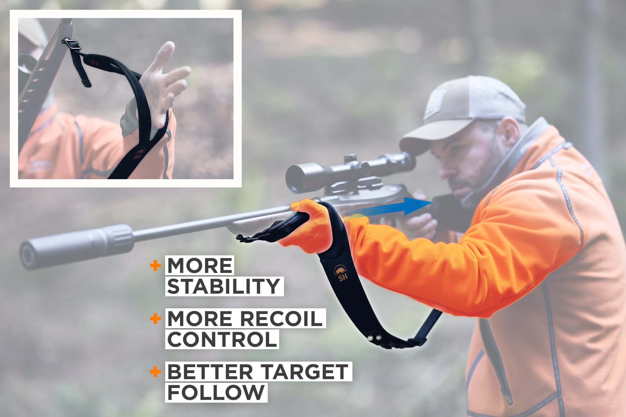 De neopreen geweerriem is voorzien van anti-slip en is in lengte verstelbaar.