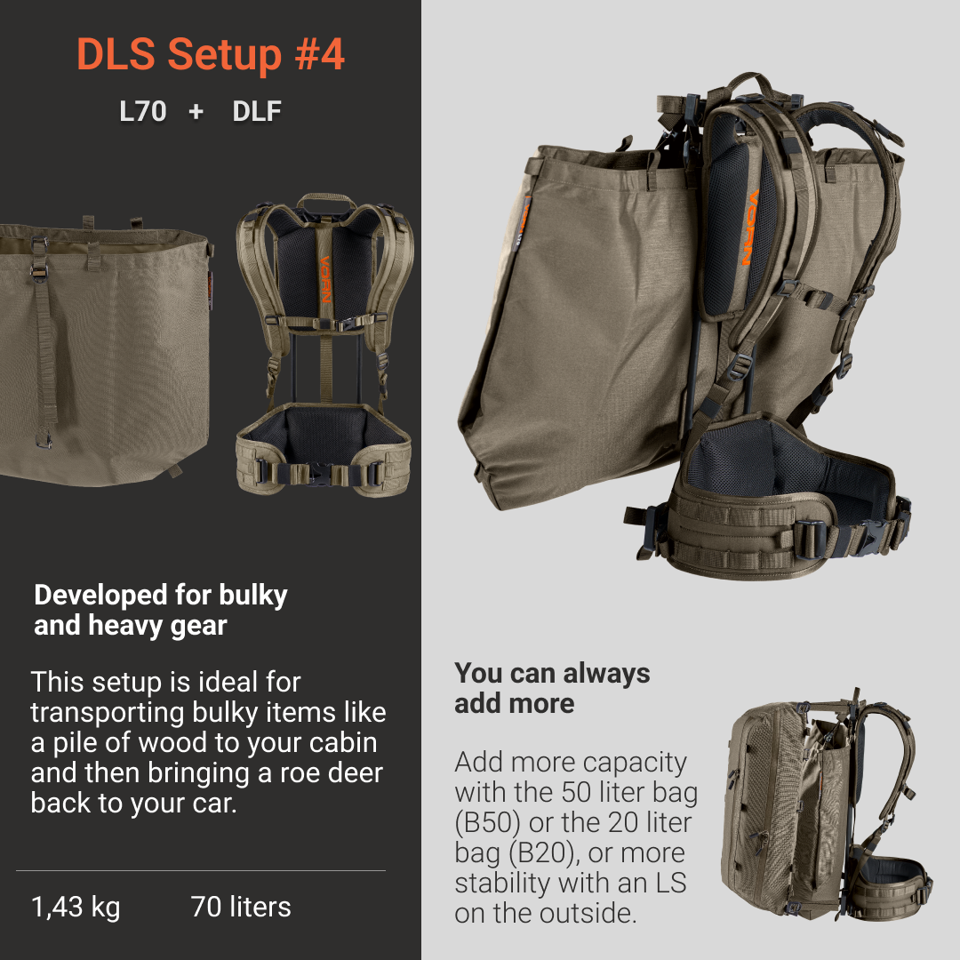 DLF: Dit is een lichtgewicht frame waar je eindeloos mee kan combineren. Door de heupriem kan je zwaar gewicht prima dragen. Gewicht op de heupen zijn gemakkelijker en langer te dragen dan meer gewicht op de schouders. Vandaar deze combinatie.